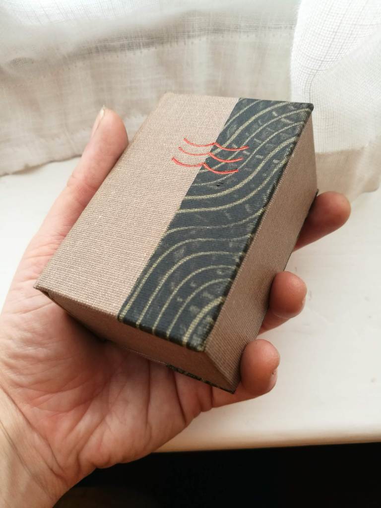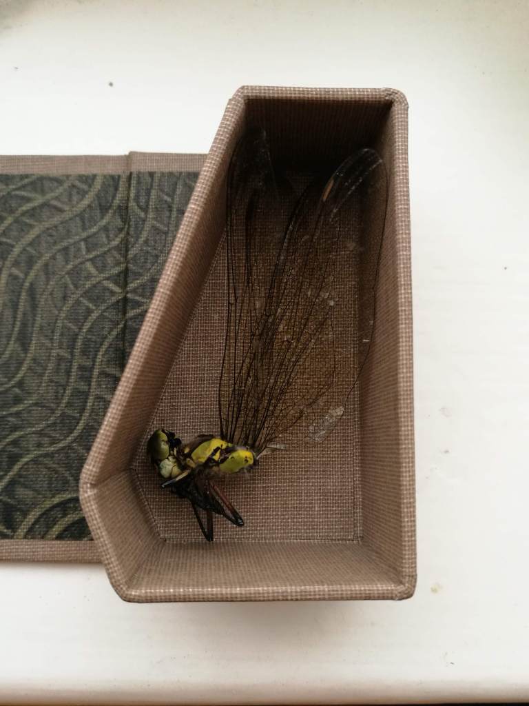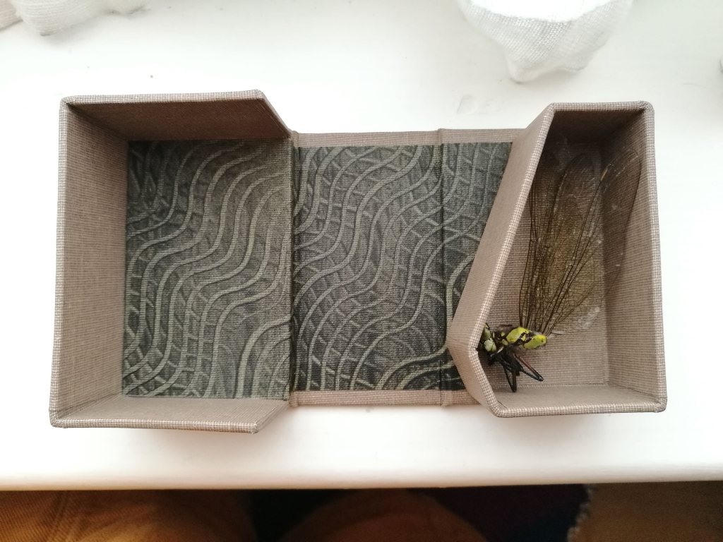 A little box made to keep half of a dead dragonfly safe. Covered with paste-decorated buckram and hand tooled on the front.